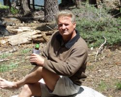 We switch-backed our way on down the mountainside until we finally came to the lake at the bottom – not the bottom of the lake.  Not a soul was in sight and it was very peaceful and still.  There was no campground (thank god) but we came upon a nice camp spot alongside the lake shortly after the road leveled out.  There was another large open site about 200 yards further down the road, pretty much at the end of the road, but to get there you had to go up another very steep stretch of loose rocky road.  All in all, we liked the first spot better, so we backed in and scouted about.  In the fifty feet or so from parked truck down to water’s edge, you dropped maybe 20 feet in elevation, but there were three plateaus in the site – one good spot for the tent about half way down to the water, a second level spot that had a fire ring, and then another large fire ring at water’s edge.  After a celebratory beverage, we unloaded the truck and kind of had things distributed to the appropriate levels and somewhat organized.