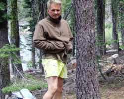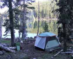 The tent was real warm and the night a perfect cool/cold temperature to get all bundled up and sleep well.  I didn’t even get up to pee, which is very unusual for a young man of my age.  I was up early as I almost always am and watched the sunlight slide down the mountain side across the lake, then flow across the lake top, then finally spread out over our site.  It was wonderful to finally feel the warmth of the sun after watching it for so long come down the mountain and cross the water ever so slowly.  It was a long time coming, and despite my failure at making it hurry up, it was definitely worth the wait.