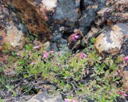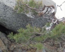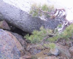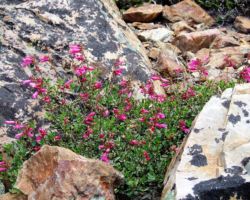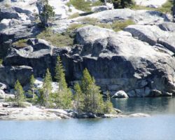 We stopped for a snack on a solid granite ledge, about twenty feet above Island Lake, with a view of several…wait, wait , wait for it…islands, many inlets, and the ever glistening, infinite tones of blue.  The trail was muddy in spots, with small rivulets of water streaming down the trail from the final vestiges of snow patches surviving for a few more days in the deep shadows.  There were some wildflowers, great boulders, and rich riparian zones around the lakes and alongside the connecting streams that “chain” them together.  But my eye was usually stretching outward, searching the ridges that divided the lake basins, searching for the next lake, trying to define islands from granite ledges stretching out into the depths; up to the precariously perched lookout on top of Grouse Ridge; up to the flag on top of Fall Creek Mountain – a sort of center piece of one of the loops of lakes that form a liquid apron around its base.