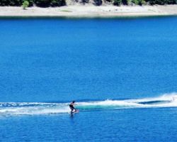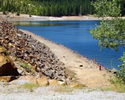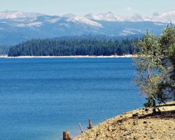 On we went in our quest for the backside of Union Valley Reservoir; what I hoped to be a rough dirt road with not many people that could be a decent spot for the boys to be boys and yet be near some water. Past Junction Reservoir which looked to be some kind of fore bay for a SMUD power generating operation. Since these reservoirs and many others throughout the Sierra’s are used for water storage and hydroelectric power, it is a safe bet. Around the next bend we were finally at the sparkling blue water with the hazy Sierra’s as a backdrop. Happy to have found it, the area was not as imagined.
