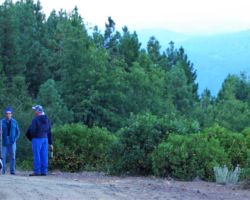 I breeze back up the hill – much easier and looser than the trip down. I gather a water bottle, wash my hands (I think), and begin to head up the road beyond camp to see what there is to see. Hark – prey tell what sound is that – a zipper perhaps? Me thinks it may be brother Kenneth. He is emerging from his tent but I cannot tell which end is protruding first. We greet each other in a manly way (as is customary) and he says he will meet me up the hill. As I gain elevation from the ascent of the road, I am losing the site of the mountains behind the trees along the road. I head back to our site to scramble up the embankment above the road where we had gathered upon settling on this camp site. It offered the perfect vista of the Crystal Range and the pending sunrise.