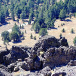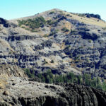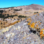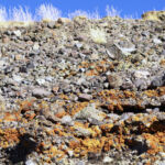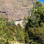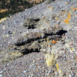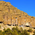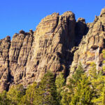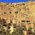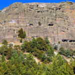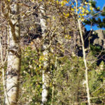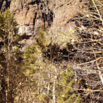 We were all pretty excited, and even though we had driven up and back down the road, we wanted to take a walk and get to know the area better. We loaded up with beverages and binoculars and camera and headed out to the main road and up towards the corral. The sun was so warm, the sky so blue, the Fall colors way more prevalent than we noticed from the truck. The views of the lake, Kirkwood, Round Top and Elephant’s Back were spectacular and ever changing with the angle of the sun and the perspective from the road. But the thing that kept drawing my attention and holding it for longer and longer was the cliff face to the North, about 300 yards from the road.