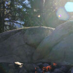 This was a bit of a different thing for me as this was not a campground, although marked as such on the Forest Service map. It had no signs, no fee, no tables or fire rings, no individual sites per se. It was just an area that was all carved up by roads that you obviously could camp at. There was also a modern 8×8 shed with a window that was on skids. Apparently it serves as a “warming shed” in the winter for hikers, snowshoers and snowmobilers. We drove out this road thinking this could be it. At the very end was a somewhat private spot with some nice rock outcroppings and a bit of a view if you looked just right; between the trees, and around the bend, and over the rocks, and out the side, through the crevice. It was a great place to stretch and have a beverage and share our thoughts and inner most feelings. But this was not the spot.