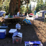 Bob went to work on the fire ring. Rings that are too large prevent much of the heat from getting on our bodies and warming us up – it keeps you too far away. And, I really like to have two areas – one to have a fire for light and warmth, and one to put the grill on for cooking. So Bob was on this in a big way. He made two excellent spaces – each a perfect size for fire and one for the grill – walled off in case of wind and level as heck for the grill. It even had some flat spots for pots, towel, tools, or whatever. We quickly found three clear and level spots for our tents and a fantastic spot under a Mountain Juniper near the fire rings and the granite outcrop for the kitchen table and water. The smaller table was set up for the bar and food prep. Honey – I’m home.