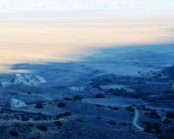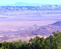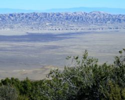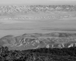 We loaded up an ice chest, day packs, fanny packs, camera, gear and equipment of all sorts and purposes and selected some appropriate tunes, and off we went. We continued driving up our dirt road; up and over the Caliente Range we were camped on and found ourselves facing southwest, looking out over the Cuyama River below along Highway 166 which serves as the county line between San Luis Obispo (the county the Plain is in) and Santa Barbara County. Beyond the road and river is part of the Los Padres National Forest and the Sierra Madre Mountains that rise up to 4,000 – the last mountains between us and the Pacific, with Santa Maria just on the other side. The river valley was very cool – enough water to support some agriculture and some development, but it was largely open country. You could smell and feel the ocean air, very faint at 45 miles inland, but still distinctive. It was very inviting, very tempting to try to make our way to Highway166 and head towards the Pacific, but it would have been another massive day of driving, and the signs said the road was gated prior to reaching 166, so we turned our backs on the sea, stuck with the original plan, and turned our attention to the very strange structure on the flattened hilltop.