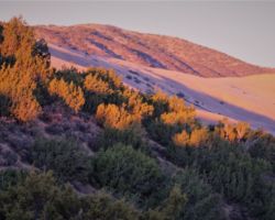 Morning was again ridiculously warm. We had a breeze come and rustle the bushes some and maybe blow some smoke around, but we are used to that – didn’t bother us none. Not being a big breakfast guy, I stuck with my “fugitive on the run” morning starter of coffee, yogurt, banana, a little pumpkin pie, and more coffee. The sunrise was spectacular – not so much for the colors, but for the shadows on all the ridges, humps, bumps, rises, and ravines out on the Plain below. Soon, we were discussing the plan for this precious middle day – the best part of the two-night trip. We decided to stay local and not spend so much time in the car. This place is very much like Death Valley – massive flat uplifted valley, surrounded by mountains, incredible geology, erosion, immense vistas, massive skies, quiet, peaceful, solitude. The Monument is large and expansive, with much human history, wildlife, and natural features to explore and find on your own. There are numerous roads and trails and we could have exhausted ourselves and still not seen much of the place, so we decided to see what we could see near us, and enjoy that. The road we were camped on was supposed to have a trailhead a couple more miles up the hill. I assumed it stopped or was gated at that point, but as we found, it was not.
