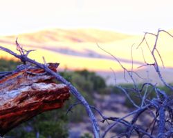 Our thirst momentarily quenched, we remounted the steed, climbing past a few more sharp curves to another wide spot and a fire ring. The BLM encourages dispersed campers to camp in existing/previously used sites. These sites are pretty obvious due to the lack of trampled vegetation, the rocks for a fire ring or perhaps charred remains from campfires. Often flat tent or sleeping sites have been cleared and/or scraped so it doesn’t take a paleontologist to see that other folks have camped in these spots. This spot did not have the totally unobscured 200 degree view of the prior spot, but it did have some large Junipers, Mahogany, and Scotch/Witches Broom along with plenty of smaller shrubs of sage and grasses. It was much greener and far more pleasant, comfortable, calming, and far less chance for dust and dirt. We were up the hill another 500 feet or so in elevation, so the views between the Junipers off the edge and out over the plain below and beyond were a bit more expansive than from the first site. It did not take more than another beverage or two before we decided this was it. We were here; six hours of driving, exploring, and discovery already made it feel like we had been gone for days; we had already seen some great things, fantastic scenery, and knew we were in a real special place. We were off to a great start and were feelin’ real good about the next couple days.