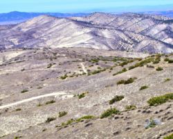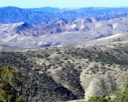 Parked at the gate, we loaded up our packs with lunch snacks and beverages. There is a trail along the hillside below us, but we decided to take the high road, as it were, and walk along the wide open ridge top. The path was perfect; wide, open, a smooth gentle rise, easy walking. We stopped often to take in the views, put the binoculars on birds, or to just soak it all in. We hunkered down in the shade about 30 feet below the road on the North slope and had a tremendous lunch with a great view out over the plains below and the Temblor Range further off in the distance. It was January 17 and we needed to find shade for lunch – unbelievable. We were just starting to think about turning around and heading back. The top of the peak was still far off in the distance so reaching it was definitely out of the realm, but the air was clear to the East and some super trippy landscapes and formations were coming into focus. We needed to continue on a bit further up the road to get a better view of this area.