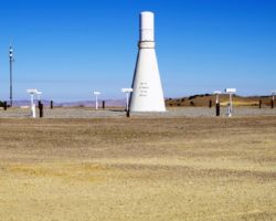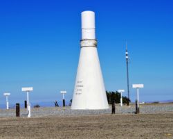 We squeezed between the shiny white 2×6 rails and walked up the driveway. The small house-sized concrete bunker hummed with AC units sticking out on all sides cooling what we assumed was massive amounts of electronics inside. Further up the road and around the bend, was a perfectly flat former hilltop, now a massive spectacularly clean gravel pad. But this was no plain, ordinary flat gravel pad that formerly was a natural hilltop; this one had a spaceship in the middle, not just the middle, in the exact center. The craft was perhaps 6 feet in diameter at the base up to about 8 feet up then tapering off to 4 feet in diameter to the top. It was maybe 25 feet tall. Around it in perfect symmetry, were maybe 20 mail box looking things surrounding the spaceship about 30 feet from the base. The boxes were about 4 feet in the air on stout posts – maybe railroad tracks like the historical markers in the Black Rock Desert and High Rock Canyon. Everything was painted white. The scene was quite striking.