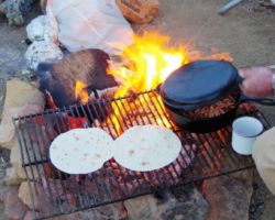 I know I have said this before, but the beauty of containerizing much of your gear is it makes loading and unloading very quick and easy. We were done in a half hour or so; an excellent spot near a massive Juniper was selected for the kitchen, the views were outstanding; a little breeze was up, but almost nonexistent on the leeward side of the Junipers. Tables, chairs, stove, were out; some gear and tents set up; tunes, beverages, and snacks; thenfire.