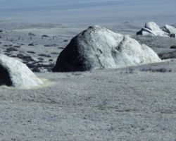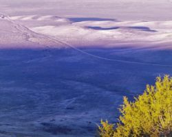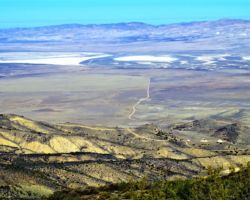 However, once we rolled down the hill to the valley floor, Bob had consulted the map (and perhaps the Bushmills, the space ship, and the gods) and suggested an alternative. We could retrace our magic carpet ride of the night before to the intersection of Elkhorn and Panorama, follow Hurricane up and over the Temblor Range to Crocker Springs Road, to Mocal Road into Fellows and onto Highway 33 North. It sounded like we would stay on back roads longer and it could possibly turn out to be a short cut, so off we went. We stopped at the intersection, picked up our bottle of Bushmills, toasted the gods, and continued on up the grade. Back in these hills was very much like Panoche – a grey/green soil, very few rocks and almost no vegetation. There were many signs warning or bad road conditions; I can imagine any amount of precipitation quickly turns these roads to real sticky sloppy muck and traction is very tough to come by. The heavy clay soils of the Mendocino NF are like this, leaving Forest Highway 7 impassible until late in the spring when it dries out, not to mention the muckiest muck around – that being the playa in the Black Rock.