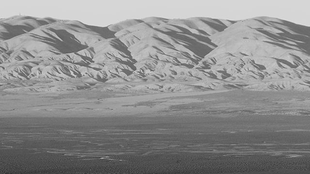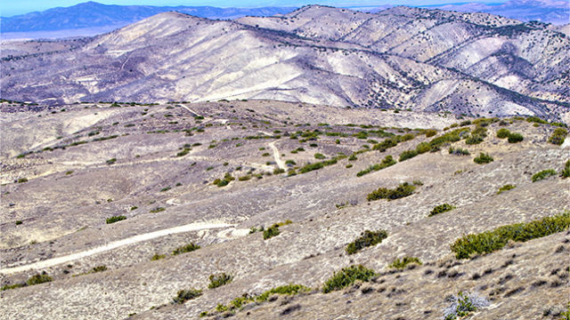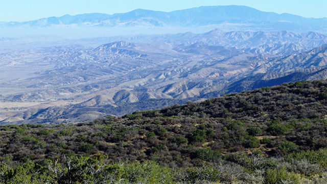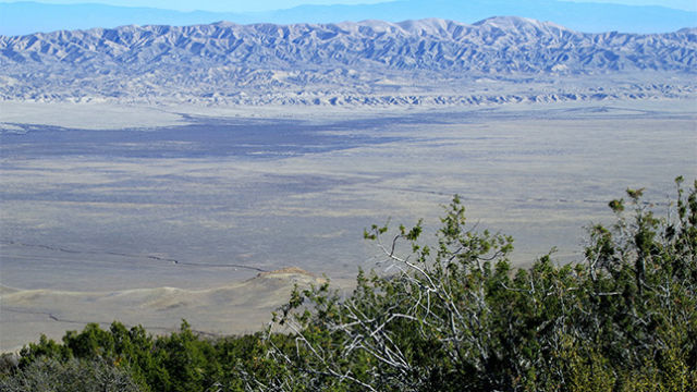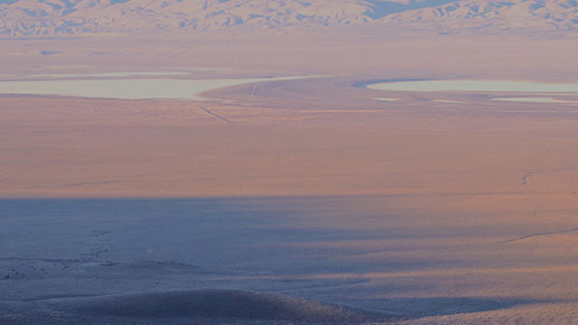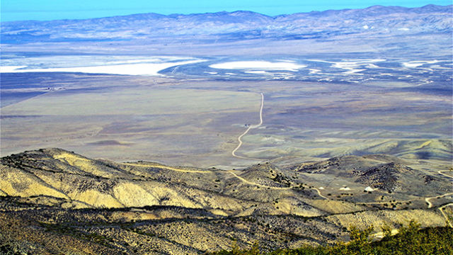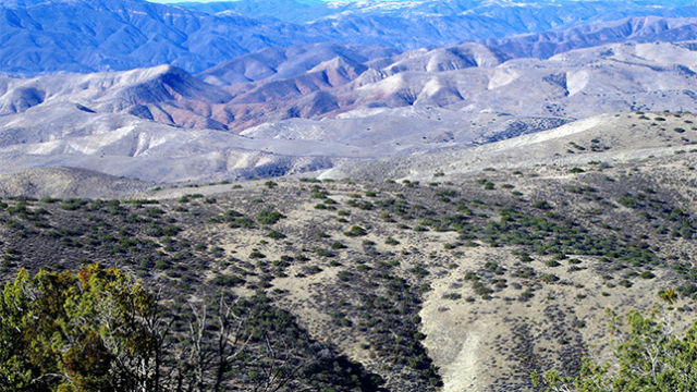 Parked at the gate, we loaded up our packs with lunch snacks and beverages. There is a trail along the hillside below us, but we decided to take the high road, as it were, and walk along the wide open ridge top. The path was perfect; wide, open, a smooth gentle rise, easy walking. We stopped often to take in the views, put the binoculars on birds, or to just soak it all in. We hunkered down in the shade about 30 feet below the road on the North slope and had a tremendous lunch with a great view out over the plains below and the Temblor Range further off in the distance. It was January 17 and we needed to find shade for lunch – unbelievable. We were just starting to think about turning around and heading back. The top of the peak was still far off in the distance so reaching it was definitely out of the realm, but the air was clear to the East and some super trippy landscapes and formations were coming into focus. We needed to continue on a bit further up the road to get a better view of this area.