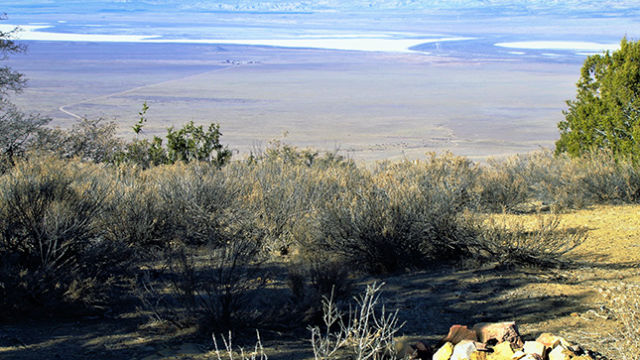 Not being a big breakfast guy, I stuck with my “fugitive on the run” morning starter of coffee, yogurt, banana, a little pumpkin pie, and more coffee. The sunrise was spectacular – not so much for the colors in the sky and clouds, but for the shadows on all the ridges, humps, bumps, rises, and ravines out on the Plain below. Soon, we were discussing the plan for this precious middle day – the best part of the two-night trip. We decided to stay local and not spend so much time in the car. This place is very much like Death Valley – massive flat uplifted valley running parallel to Death Valley, surrounded by mountains, incredible geology, erosion, immense vistas, massive skies, quiet, peaceful, solitude. The Monument is large and expansive, with much human history, wildlife, and natural features to explore and find on your own. There are numerous roads and trails and we could have exhausted ourselves and still not seen much of the place, so we decided to see what we could see near us, and enjoy that. The road we were camped on was supposed to have a trailhead a couple more miles up the hill. I assumed it stopped or was gated at that point, but as we found, it did not.