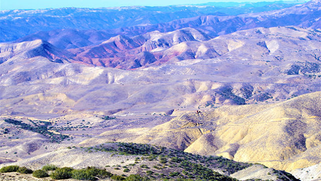 However, once we rolled down the hill to the valley floor, Bob had consulted the map (and perhaps the Bushmills and the gods) and suggested an alternative. We could retrace our magic carpet ride of the night before to the intersection of Elkhorn and Panorama, follow Hurricane up and over the Temblor Range to Crocker Springs Road, to Mocal Road into Fellows and onto Highway 33 North. It sounded like we would stay on back roads longer and it could possibly turn out to be a short cut, so off we went. We stopped at the intersection, picked up our bottle of Bushmills, toasted the gods, and continued on up the grade. Back in these hills was very much like Panoche – a grey/green soil, very few rocks and almost no vegetation. There were many signs warning or bad road conditions; I can imagine any amount of precipitation quickly turns these roads to real sticky sloppy muck and traction is very tough to come by. The heavy clay soils of the Mendocino NF are like this as well and Forest Highway7 also is impassible early in the season until late in the spring when it dries out.