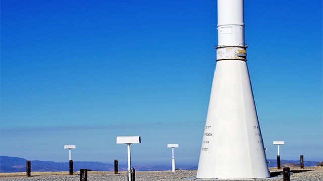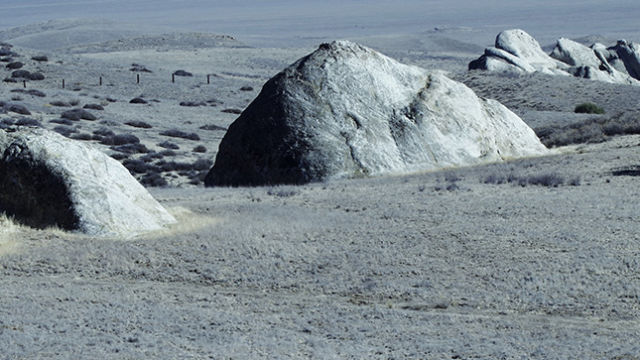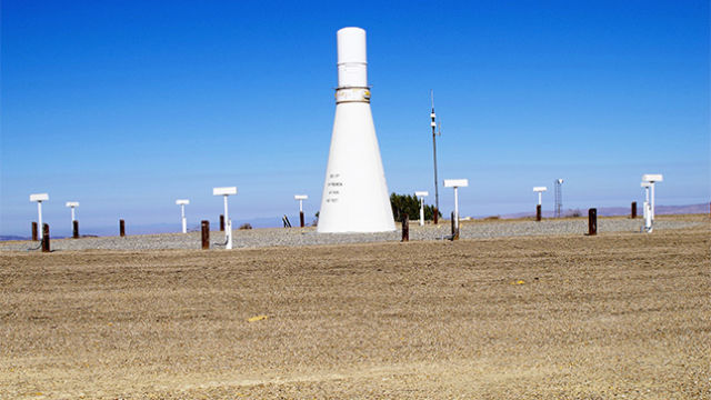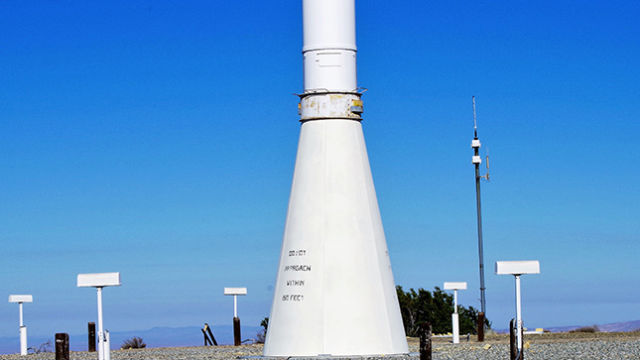 So squeezed between the shiny white 2×6 rails and walked up the driveway. The small house-sized concrete bunker hummed with AC units sticking out on all sides cooling what we assumed was massive amounts of electronics inside. Further up the road and around the bend, was a perfectly flat former hilltop, now a massive spectacularly clean gravel pad. But this was no plain, ordinary flat gravel pad that formerly was a natural hilltop; this one had a spaceship in the middle, not just the middle, in the exact center. The craft was perhaps 6 feet in diameter at the base up to about 8 feet up then tapering off to 4 feet in diameter to the top. It was maybe 25 feet tall. Around it in perfect symmetry, were maybe 20 mail box looking things surrounding the spaceship about 30 feet from the base. The boxes were about 4 feet in the air on stout posts – maybe railroad tracks like the historical markers in the Black Rock Desert and High Rock Canyon. Everything was painted white. The scene was quite striking.