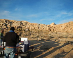 Tom and I had to work half a day so we were a few hours behind. A stop for In-N-Out burger in Stockton and to buy a grill since I forgot this item (yes, again), and we blasted down Interstate 5 as quickly as possible. We were up and over Tehachapi before sunset and almost got to the campground before darkness. Neither our message to Bob and Steve nor their message to us got through during the drive down, but as we turned into Ricardo campground and headed around the loop, the second camp site we passed had some suspicious looking characters in it. We had arrived.