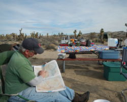 For all the “roads” breaking off this main access road, most of them were motorcycle tracks, wide enough for a vehicle, but real loose and gravelly or sandy, and often up steep hillsides. Kind of rough for the boys’ style. We were paralleling the Sierra’s again, although there was some debate whether they were the lower ridge in the foreground, or the taller one to the West. Nonetheless, it was neat to know they were out there with us, despite our heads being in the Mojave surrounded by Joshua trees.