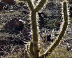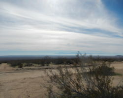 We stopped at the bottom of a very steep track ripped out of short rise that could give us pretty expansive views if we were to make it up there. Not knowing what it was like up there and the roughness of the scar we would be driving on, I decided to bow from the opportunity. We turned around and headed back to an opening the in Mesquite or Creosote Bush that had an old fire ring. We got out and roamed about. The brush was 5 or 6 feet tall and the hill that we decided not to surmount blocked out view to the West. This would not do.