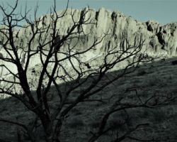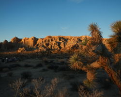 I was able to walk along the edge for several hundred yards; stopping occasionally to set my feet, get my balance before looking around in all directions to soak it in. I found a good spot to sit and had my beverage. I listened to all the camp sounds and enjoyed the view from up here. I absorbed as much as I could. As I scrambled down the back side where the rock wall was little more than a jumble of boulders and eventually just the sand of the desert floor, I saw a great little grove of Joshua trees up in one of the myriad of side canyons and washes. I headed up into it and sat for an hour or so it seemed, just sitting quietly, letting my mind wonder to the past and to the future. It was a great spot.