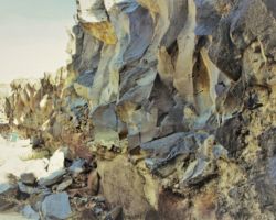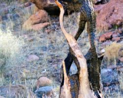 The small washes, rivulets, and depressions that the water made as it ran off the steeper slopes and onto the desert floor were fascinating. As the wash slows on the flatter ground, the depression gets shallower and broadens out and braids into a rainbow of light browns and grays. It is truly an apron effect from hillside to flattened desert floor. On the backside of the formation, someone had burnt a collection of materials and left behind a few bed or seat springs. I gathered them up and brought them back to the boys at the site, much satisfied with my off-road excursion.