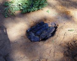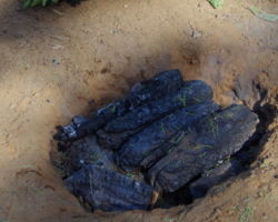 At 4:00, it was decided to just go for it. The coals were black, not glowing red, but it was almost all oak, and it was late. We wouldn’t eat until 7:00 at the earliest, so we needed to leap and hope for the best. Steve had dug a great hole; maybe 2 feet deep and 18 inches wide in good red clay soil. We dropped a nice bed of our best coals in the bottom and dropped the 14 quart oven on them, then we stacked the 12 quart on top of it, and poured the rest of the coals in. We needed to place a few blackened logs on top of the hole, not only to fill it up so the dirt wasn’t all around the lid (I also forgot the lid puller off tool gizmo), but also to cram all the heat we could into that hole. For no practical reason, Bob put some Fir branches on top of the hole and we covered it with dirt. The confidence level was not high, but it was going to do what it was going to do. The boys were together at a fantastic spot along the creek, and it was all good.