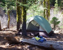 A few miles further up Silver Fork Road, I turned right on Forest Road 9N10, a dry dirt road that dropped to the creek, crossed it, then rose again. I saw movement off in the bushes and slowed enough to see Steve coming to greet me. The sharp right turn was manageable, but it dropped away steeply so that I could not see the direction or the condition of this road at all. I stopped on the precipice, got the go-ahead from Steve and dropped over the edge. The road quickly dropped into a wide open, relatively flat spot, with plenty of room for rigs, tents, tables, etc. It was a real nice spot. I was greeted by the boys who were busy gathering wood, setting up tents, generally preparing camp. It was great to be there.