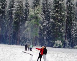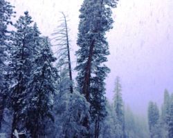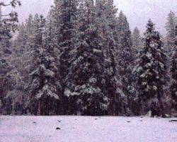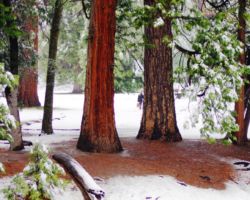 We were headed off to Curry Village for a coffee and a hot chocolate or 2, if Curry Village hadn’t been eliminated in the avalanche we heard. The few people that were up and around Curry this early in the morning were all abuzz at the snow and the scenery and the spectacle. In a few minutes they began serving breakfast so we went through the cafeteria style food court piling up French toast, pancakes, bacon, and ham. It was great fun to get a warm breakfast on a snowy morning. Full, warm, and raring to go, we needed to get back out in the snow and decided to head to the Ahwahnee. That was a magical walk – across the meadow, into the woods, along the river, over the bridge. Each area was so beautiful, covered in snow; we just tried to take it all in and fill up on this experience.