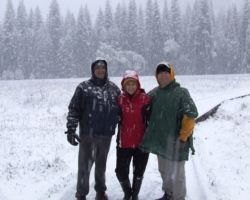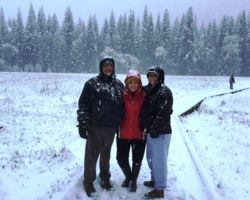 I went over to Haley’s tent and clawed on the tent as I do on her door at home in the mornings to wake her up. She made some kind of mumbling grumbling noise – the kind you make when you don’t want to be awake, so I asked louder if she had to pee. Of course she said yes, and when she got out of the tent and on stable ground and cleared her eyes, she too squealed at the sight. It was so cool to be up before dawn to have it snowing these massive flake, straight down, calm and peaceful as could be, gently floating to the valley floor. The only noise was the three of us; like dancing bears, prancing about, laughing and giggling and letting flakes settle onto our tongues and in our hands, trying to soak it all in.