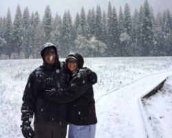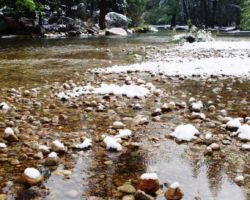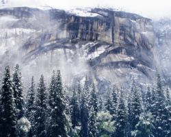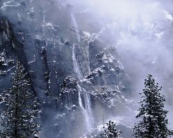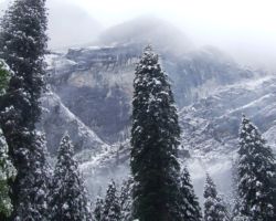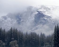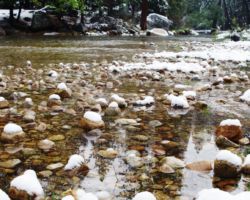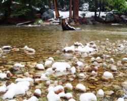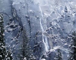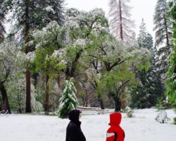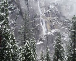 We went back to the camp sight and got socks and pants and hats and gloves and scarves and prepared to head out again. As we were mustering in the opening outside our tents, we heard the rumbling of snow and rock tumbling down the Glacier Point wall. It was eerie and would definitely have been scary if we weren’t so taken by the falling snow and the wonderful winter scene. This was, after all, the exact location of the massive rock slide in 1996 that thrashed Happy Isles and this campground and killed a camper – in her campsite. What we heard also must have been a massive amount of material crashing down an unknown distance off the wall, an unknown distance away. Fortunately for us, it was just another wondrous event that added to the spectacle and awe of this incredible morning.