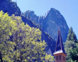 We wandered about a little, asked about the cabins and such. Mike grabbed some ice on our way back. It had cleared by then and the weather was looking good so K and I walked back to camp. Mike and Sharon wanted to see the Ahwahnee so we decided to meet over there in an hour or so. K and I got on our bikes for the first and only time for the trip, kind of a tradition now, but at least we did ride them to the Ahwahnee, also a growing tradition. We meandered a bit farther into Yosemite Village. Checked out the cemetery and had a real nice lady, an employee, suggest we get the self-guided brochure so we know what we are looking at. She showed us the marker for one of the first superintendents whose name escapes me now. We will have to return to do that someday, but for now, we had to settle for riding up around the housing and looking at some of the old cabins and such. Before long, it was time to meet Mike and Sharon.