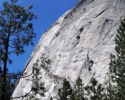 We decided to take a walk out to the bridge. Earlier in the day, I had imagined seeing climbers on the face of Half Dome and wanted to see if we might possibly see the light from their hammock hanging 3,000 feet above the valley floor. We didn’t see any flashlight, and I probably didn’t see any climbers earlier in the day either, but what a site we were treated to. The Royal Arches were highlighted by the moon in a perfectly soft but luminescent light. Not only could we see the moisture working its way out of the cracks and crevasses of the solid (or not so solid as it may be) granite wall, but the dark stained areas of the arches contrasted with the lighter colored (newer?) granite to make an incomprehensibly beautiful scene.