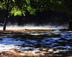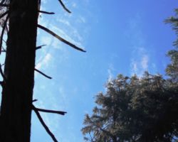 Admitting to the defeat of the failed Gin Fizz attempt, and being sufficiently rested and warmed (dry would have to wait some time), we began our journey back to the campground. The snow had ceased falling for the time being, but the warming air and intermittent sun was provoking clumps of snow to crash out of the trees. This made for great fun walking through the woods. We couldn’t help but shrug up our shoulders and pull our heads inside, doing the best turtle impression we could whenever we heard the sweep of the snow pass through the tree leaves and branches as it broke away, bracing for the inevitable thump as the load spanked the ground. No one was hit, directly anyway, but we laughed and laughed as they fell near , sprayed us with mist as they broke apart overhead, or splashed up from the growing pools and puddles of snowmelt.