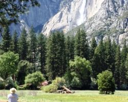 We got a great table outside on the patio. I wanted to stay in the sun to warm up and absorb some rays. The other 3 wanted to stay in the shade and all were happy. It was the typical scene back there. The lawn was full of kids running and babies tumbling and groups big and small gathering for photos. Some people were really dressed up and others had just finished long hikes and big rides. One of the beauties of Yosemite; for all the fancy people and big money flaunted around, especially at the Ahwahnee, preference is still given to nature and those who get out into it. John Muir and Teddy Roosevelt and the climbers and explorers and naturalists still maintain top billing. It hasn’t become another Disneyland or WallyWorld yet.
