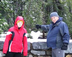 It rained pretty good again that night. The morning was gray and overcast, but no rain. We had a good breakfast and lots of coffee around the fire. It began to drizzle off and on so we were not sure what to do. We decided to waddle over to Curry for showers. We hung inside after and looked at the massive photos of Curry of yesteryear. There were several images of the Firefalls and photos of the guy that yelled up to Glacier Point, “Let the fire fall”. My mom said that the first neighbor she had at Nazareth House when she first moved in used to be that guy. He also played the piano and sang. I figured these photos were not of him, but probably the original Mr. Curry. Mom’s neighbor might have been one of the last guys to do it. I believe the last Firefall was in 1968. I was lucky enough to see it as a little kid, but I still don’t know why they yell out “Elmer” before and after the Falls and randomly at night – must have been a gag years ago that a few of the old timers carried on.