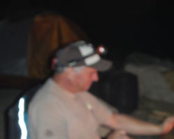 intake had obviously taken its toll and he was badly in need of help; Bob arrived in his rig and picked us all up and brought us back to the ridge top camp; Jerry still feeling the outdoorsman oath had been badly violated called out to the young boys from SF in the campground; the youngsters taking the bait were then rudely, loudly and violently railed against for the next 10 minutes or so being exposed to all sorts of foul language and vulgar threats to all parts and pieces of their bodies; either from exhaustion or unconsciousness, the screaming at the campground ended shortly before midnight, and the boys finally were back at their ridgetop camp; somehow the next morning cell reception was attained, directions to a tow truck driver were provided, it showed up and towed said vehicle away. I assume we had enough rigs to distribute people and gear for the rest of us to get home, as Ken and Dave were not heard from until well down the hill the next day. Many questions remain of that trip, but I think we were all glad to be going back, even though we were missing Dave and Bill.