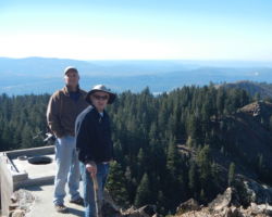 Morning came; all were where they should be as far as I could tell. Ken seemed to have been up for hours, but no fire and no coffee had been made. Soon both were in great supply and the boys had gathered to tell their tales. There was much lounging about, until a call for a hunt for the wagon tracks rang out. This lasted at least 30 minutes, alas no wagon wheel ruts were found and the boys returned to camp exhausted mentally and physically. I would have felt very silly if I had gone to this place twice and still not made it up to the fire lookout, so we mounted another trek up to the lookout. The views were well worth the price of admission although we may have caused massive interruptus for the young couple up on the deck of the lookout. It brought back fond memories.