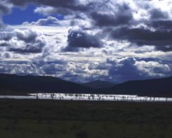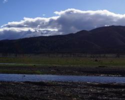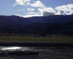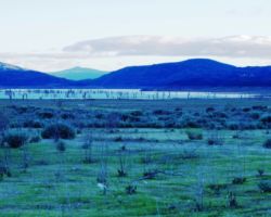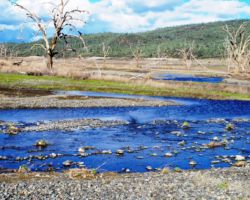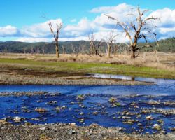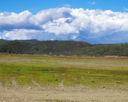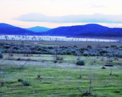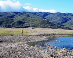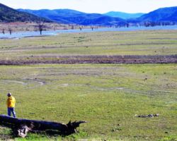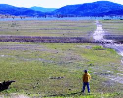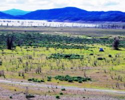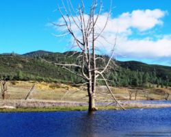 We walked out around a point and finally, on the far side of the reservoir, we could see the lowest point, covered by some amount of muddy waters, pierced by dozens of trees, bleached white; a haunting contrast to the greyish brown water, the red mud ring exposed by the receded water, and the green brush above the line formerly marked by water. Beyond the last pools of water, the grassy plains now looked more natural than what would have been a huge bathtub of agricultural irrigation. One could easily see this scar returning to a more natural state if allowed or provided the chance with continued drought.