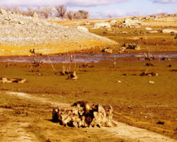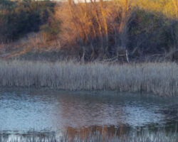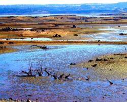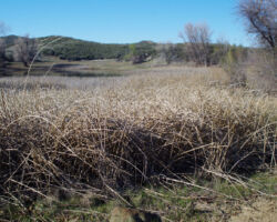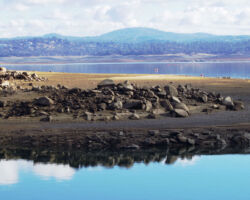 We walked out around a point and finally, on the far side of the reservoir, we could see the lowest point, covered by some amount of muddy waters, pierced by dozens of trees, bleached white; a haunting contrast to the greyish brown water, the red mud ring exposed by the receded water, and the green brush above the line formerly marked by water. Beyond the last pools of water, the grassy plains now looked more natural than what would have been a huge bathtub of agricultural irrigation. One could easily see this scar returning to a more natural state if allowed or provided the chance with continued drought.