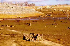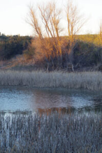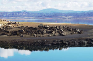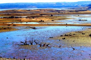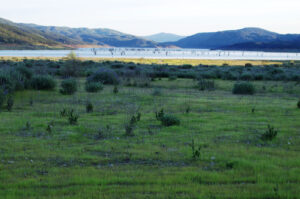 We walked out around a point and finally, on the far side of the reservoir, we could see the lowest point, covered by some amount of muddy waters, pierced by dozens of trees, bleached white; a haunting contrast to the greyish brown water, the red mud ring exposed by the receded water, and the green brush above the line formerly marked by water. Beyond the last pools of water, the grassy plains now looked more natural than what would have been a huge bathtub of agricultural irrigation. One could easily see this scar returning to a more natural state if allowed or provided the chance with continued drought.