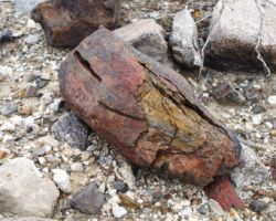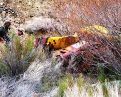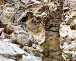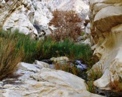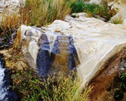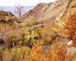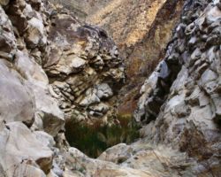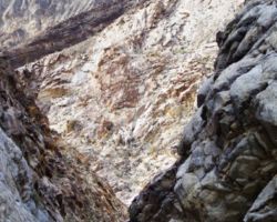 We passed one yellow mangled trailer or vehicle mostly buried in the canyon. It appeared to be a commercial trailer perhaps used when they were trying to maintain the road that once, apparently, came up this canyon. It is extremely hard to believe a road ever came up this canyon and if not for the historical record of the stage and the amount of ore they took out of Panamint City high up in this canyon, I would never believe that people were able to drive to Panamint City in station wagons in the 50’s, or Jeepers came through in the 80’s, even if they had to winch their way up the 2 or 3 6’ waterfalls that existed at the time. Now, it is difficult to walk through, and driving, motorcycle, or even mule is just way beyond comprehension. Thankfully, and I don’t say this often, a court closed the canyon to vehicles, or I am sure yahoos would still be ripping it up and destroying it.