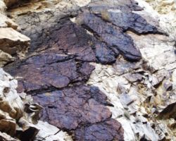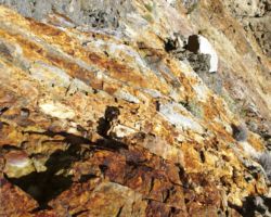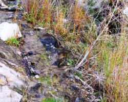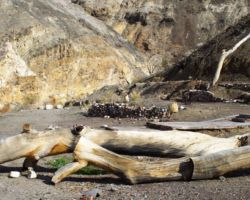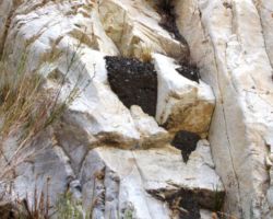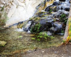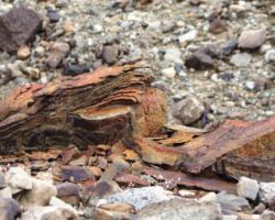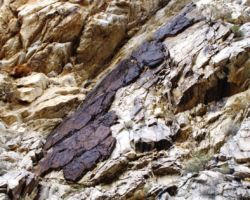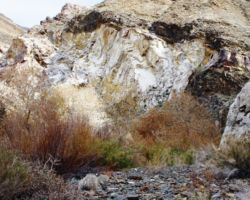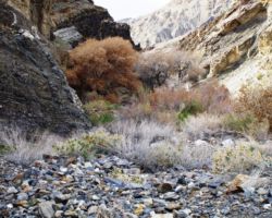 We only saw one birdie which was disappointing considering the water and vegetation. We did hear a froggy though; perhaps he was less impressed with our gibberish as we slowly made our way up, and we were just too much for the birds. We hadn’t gone nearly as far as we had hoped we had gone, and knew we weren’t getting anywhere near Panamint City, so the question was how far to go. I wish I knew that Limestone Spring was 1.7 miles up, as I would have liked to get that far and kind of know we had gone that far, but perhaps another time. We came to a large yellow commercial truck, on its side and 60 percent buried. It could have been a road construction truck that pulled the trailer below that had been washed further down the canyon in one of the numerous colossal flash floods that occurs in these parts. Above, the canyon seemed to open a bit and perhaps even flatten its grade a bit, but as with hiking up those backpacking switchbacks, the top never seems to come, and the next turn leads only to another turn. We figured we had accomplished enough and had been treated to extraordinary scenery, mind-blowing geology, and had had a private showing, so we were happy with our exploring and any thoughts of pushing further up the canyon were unmatched with the needed energy and tenacity.