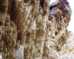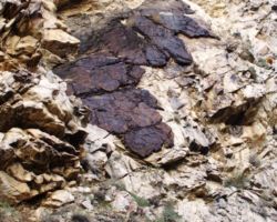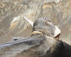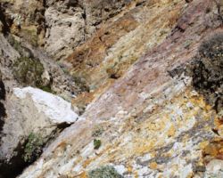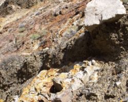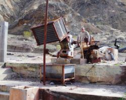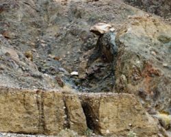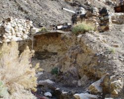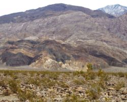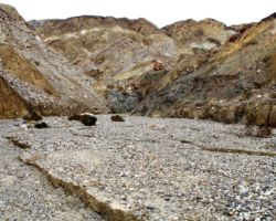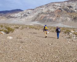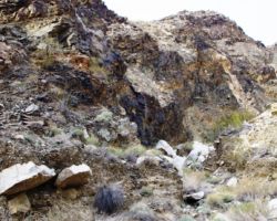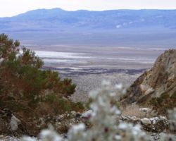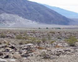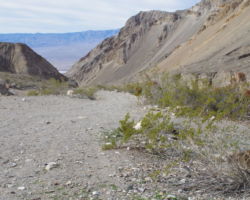 We soon began preparations for the penetration of Surprise (not Story) Canyon. We gained much valuable experience the day before, especially with how much rock weight one can carry in day packs before the zippers open. Yesterday had gone so well, we were confident in the days sortie. Preparations complete, we were off by 9:00 or so again, with a great day ahead of us. We again found the signage lacking, but being the intrepid explorers we were, we figured the massive RVs and 5th wheels marked the spot. They actually were just about in the location of the tri-weekly stage that ran from Darwin, to Lookout, to Ballarat and then up Surprise Canyon to Panamint City from 1874 to 1876. Although only un pero was waiting outside now, we followed his advice and headed up the road. We stopped at the last bend in the road before being up in the canyon for a vista out over the valley reaching out in both directions below. The road was bounded by a 15 foot wall of rock debris, the former top of Telescope Peak on one side, and a 20 x 20 chasm on the other, the shoot that deposited much of the debris out in the open plain.