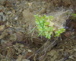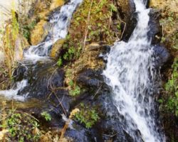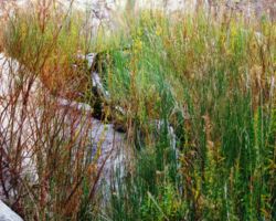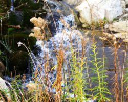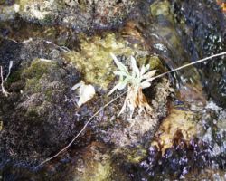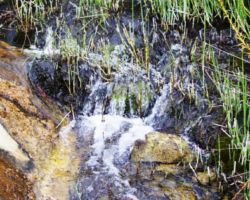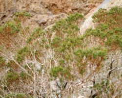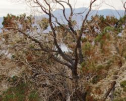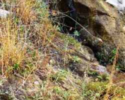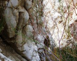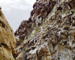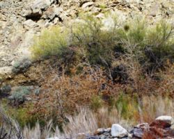 There were a couple stair-step cascades that developed 5’ x 5’ by one foot deep pools at the bottom. The narrow canyon was full of brush and small cottonwood and willow, thick enough that you had to pick your way and push branches out of your path. In many places, the brush was 8 – 10’ tall and along with the narrow vertical walls, you could easily feel claustrophobic. However, there also are numerous side canyons and wide spots and rock ledges, one of which was used for a break, for as with the alluvial fans, the brush and slow going of clamboring over rock falls, and along narrow ledges, masks the fact that you are constantly and steadily climbing elevation. My breathing was never really labored because you don’t really have enough open space to get a good pace going, with hunting for the trail, picking courses, carefully placing feet to choose the most stable footing, trying to be careful to do minimal plant crushing and cause minimal erosion in the creek bed, working hand holds on the rock faces that must be traversed.