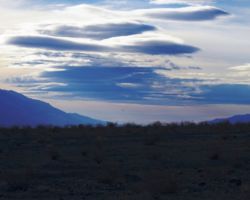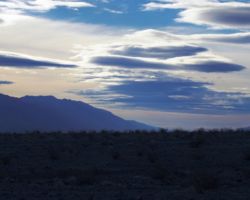I was interested to see what fire or other lights we could see as darkness fell. The clouds covered all but a few stars and most of the moonlight. Steve and I took a great walk up the road across the wash, up the fan, up and up, past one bend and then another and if the road doesn’t end by this point and that. The fans don’t look like much, but your breathing and the vista you attain when you turn around let you know you are climbing. We could probably have crested this fan, and then dropped down into the perpendicular wash behind us at the base of the Argus to pick up Nadeau road and circle back around to Minnieta road and then onto our spur, However, I didn’t think I was up for that, and as it was, when we stopped our trek and decided to simply turn around and retrace our steps back down the road, we still got onto a different track, fortunately one that I had been on during my early morning walk, so trying to do something more extravagant that night might surly have turned into much more than we were up to.
