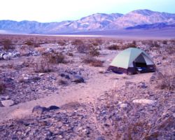 We retraced our steps, or roll as it were, back to the valley side of Minietta road to ensure the view we wanted. After some scouting about, including crossing and driving through a wash that was perhaps 40 feet across and 20 feet deep, up the other side, then back down the wash and back out on the side we entered, and deciding we didn’t want to do that again, we found a little spur that would get us alongside the wash and maybe a hundred or more yards off Minietta. The Creosote Bush was not as thick or as tall as I had hoped, to give us some sense of not being so exposed, but the views were exceptional, the desert pavement was smooth enough in enough spots for tents and camp, and we were at the end of a very long day. This was camp.