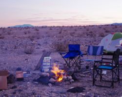 It wasn’t long before our neighbor’s fires could be seen far off in the distance; the sand dunes, Ballarat, and high up on Telescope, and soon our camp visitor returned. The little fox was incredibly brave or tame, He came within feet of us sitting in our chairs and grabbed pieces of bread or a slice of sausage; we thought he’d appreciate some water but interestingly enough, he wasn’t interested in the liquid – he too was happy with the meat and bread. Very very interested it turned out, so much so that in the middle of the night, he was spotted on top of our camp table, sniffing about and opening container lids to explore whenever possible. He toppled pots and pans and made a huge racket.