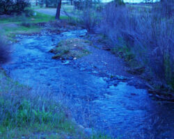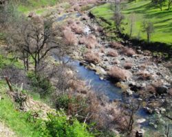 We drove out to the spot Mike and I camped, and then out to the water’s edge but it was completely open out there; no shrubs, or trees, not even old snags long drowned by the reservoir. They are king of creepy on one hand, but very cool and impressive also. Especially with the potential for pending weather, I wanted some ability to rig a tarp for wind and/or rain shelter. So, we got back on Bartlett Spring Rd. and headed further West down the road to check out the NorthWestern arm of the reservoir that was now more like a natural creek winding its way through the riparian plain and eventually flowing into the reservoir.