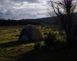 We set up camp in a jiffy, tents were prepped, kitchen stocked, beers emptied, this was working out well. This day was spectacular; blue, calm, warm, dry. We BBQ’d chicken drum sticks and thighs and just sat on the tailgate and mowed through them. The breeze picked up so we dropped the table to use it as a wind barrier while we cooked. By the time we ate and cleaned up a bit, the wind calmed completely and the night was gorgeous. We had a nice fire and easy chatting. Jordan put some of the berry pie on the grill to warm it up for dessert – it was outrageous. That may have been the last straw that put me down and out fairly early to bed. It was a great day.