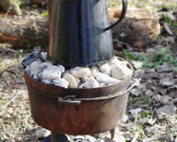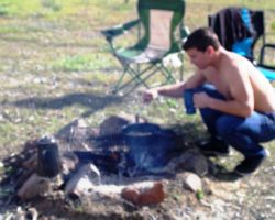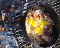 I was up early to a glorious morning. The clouds were definitely threatening, but no wind and not cold at all. I had a great little fire, made coffee, and baked the biscuits in the Dutch oven. Jordan made perhaps the best breakfast I have ever had. He cut up a ton of pepper bacon in the cast iron, dumped it out, then put in some shredded potatoes and then scrambled eggs and then added the bacon back in – my god was it good. I could have crawled back to bed, but Jordan was raring to go.