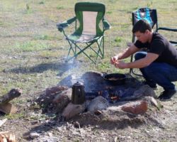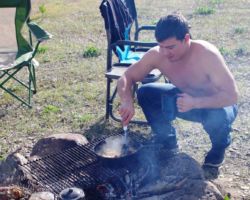 By now it was about 8:00 and Jordan and the other guy were back at camp. We cooked and ate dinner together. They didn’t each much but they very much appreciated the effort. The other guy now realized he had lost his wallet and he was a bit fidgety, so they borrowed our lantern and flashlight and headed back to the Dodge to hunt for the lost wallet. These guys were something else. After a bit they returned, and we discussed options. I offered to take them back to Dakota’s house in Clear Lake right then, although I wasn’t excited about it. For his part, he expressed concern about me driving back alone on these desolate roads. We figured we could take him back in the morning, unless by some miracle someone else came to the rescue at this time of night.